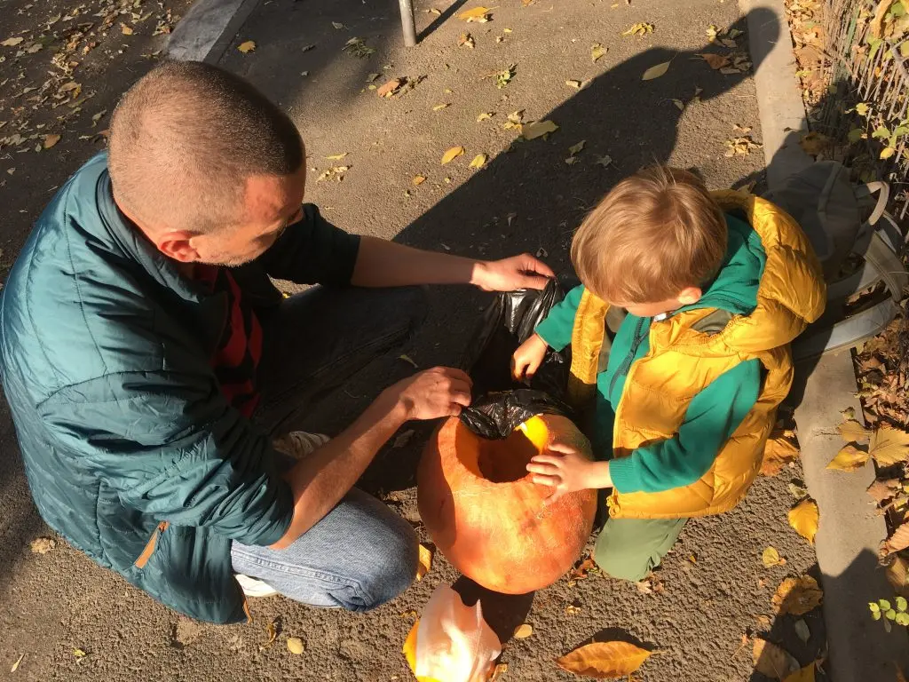 Ce am realizat pe lângă un dovleac zâmbitor și ciuruit? I-am hrănit cele trei nevoi: de competență (a dat găurile singur și tot el l-a și golit de semințe), de conectare (a fost o activitate realizată împreună cu tatăl său) și control (el a decis cum trebuie să arate dovleacul).